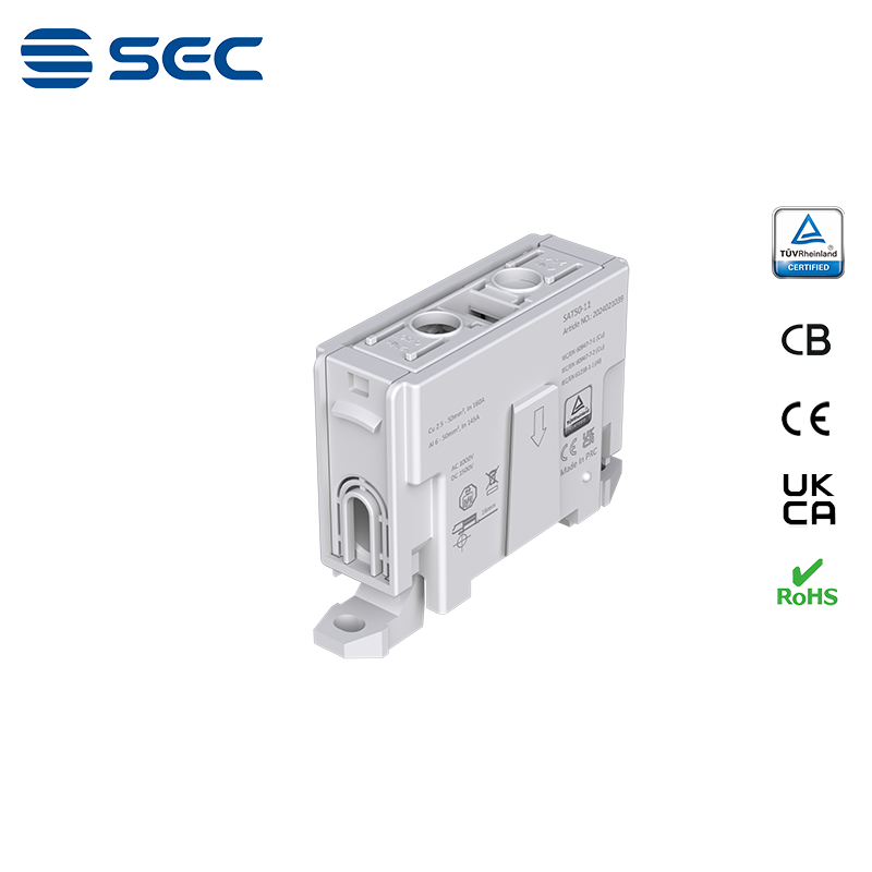 SAT series Al/Cu universal terminal block is totally patent design product by STRONG ELECTRIC, which offers the best quality, safety installation features in the market. All the product already got TUV mark, CB,CE,UKCA, RoHS certificate. It was designed for both copper conductor and Aluminum conductor. The most important is this terminal block are allowed each pieces of product can connect each other easily.