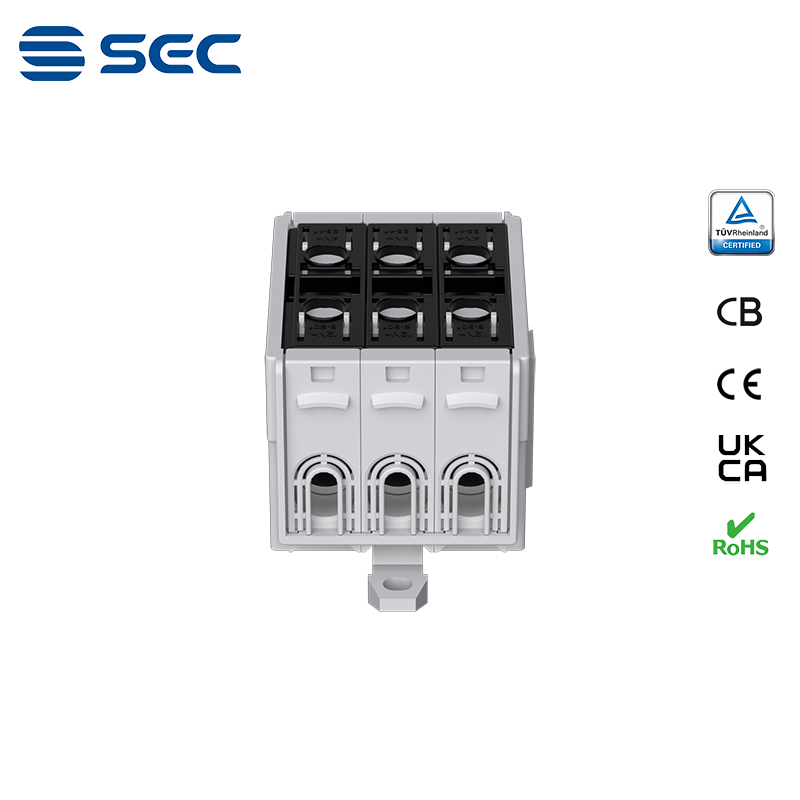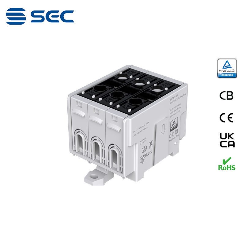 SAT series Al/Cu universal terminal block is totally patent design product by STRONG ELECTRIC, which offers the best quality, safety installation features in the market. All the product already got TUV mark, CB,CE,UKCA, RoHS certificate. It was designed for both copper conductor and Aluminum conductor. The most important is this terminal block are allowed each pieces of product can connect each other easily.