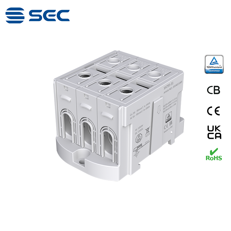 SAT series Al/Cu universal terminal block is totally patent design product by STRONG ELECTRIC, which offers the best quality, safety installation features in the market. All the product already got TUV mark, CB, CE, UKCA, RoHS certificate. It was designed for both copper conductor and Aluminum conductor. The most important is this terminal block are allowed each pieces of product can connect each other easily.