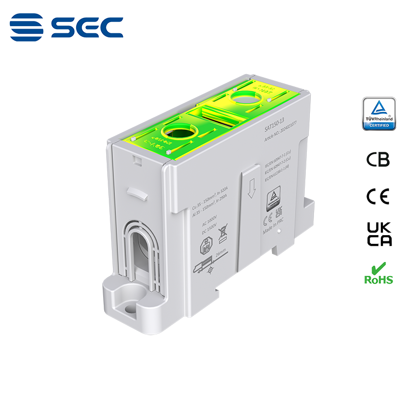 SAT series Al/Cu universal terminal block is totally patent design product by STRONG ELECTRIC, which offers the best quality, safety installation features in the market. All the product already got TUV mark, CB, CE, UKCA, RoHS certificate. It was designed for both copper conductor and Aluminum conductor. The most important is this terminal block are allowed each pieces of product can connect each other easily.