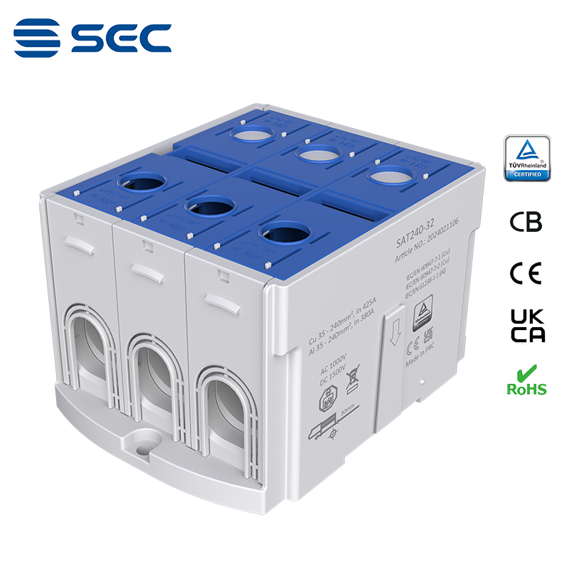 SAT series Al/Cu universal terminal block is totally patent design product by STRONG ELECTRIC, which offers the best quality, safety installation features in the market. All the product already got TUV mark, CB, CE, UKCA, RoHS certificate. It was designed for both copper conductor and Aluminum conductor. The most important is this terminal block are allowed each pieces of product can connect each other easily.