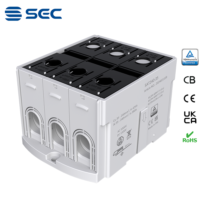 SAT series Al/Cu universal terminal block is totally patent design product by STRONG ELECTRIC, which offers the best quality, safety installation features in the market. All the product already got TUV mark, CB, CE, UKCA, RoHS certificate. It was designed for both copper conductor and Aluminum conductor. The most important is this terminal block are allowed each pieces of product can connect each other easily.