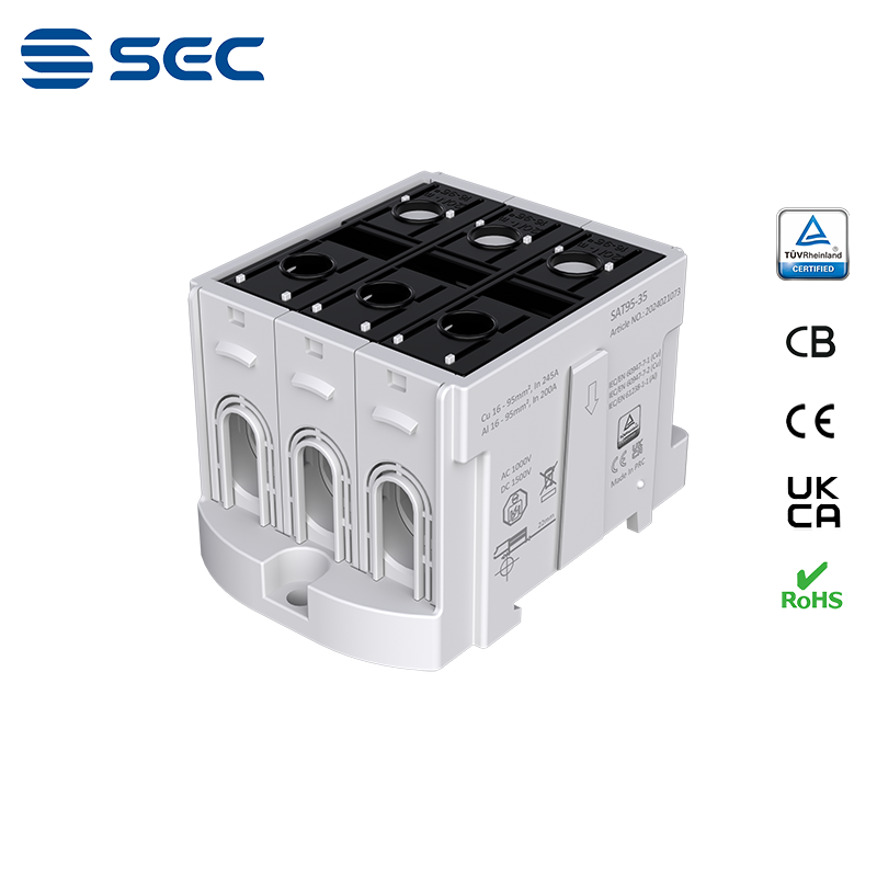 SAT series Al/Cu universal terminal block is totally patent design product by STRONG ELECTRIC, which offers the best quality, safety installation features in the market. All the product already got TUV mark, CB, CE, UKCA, RoHS certificate. It was designed for both copper conductor and Aluminum conductor. The most important is this terminal block are allowed each pieces of product can connect each other easily.