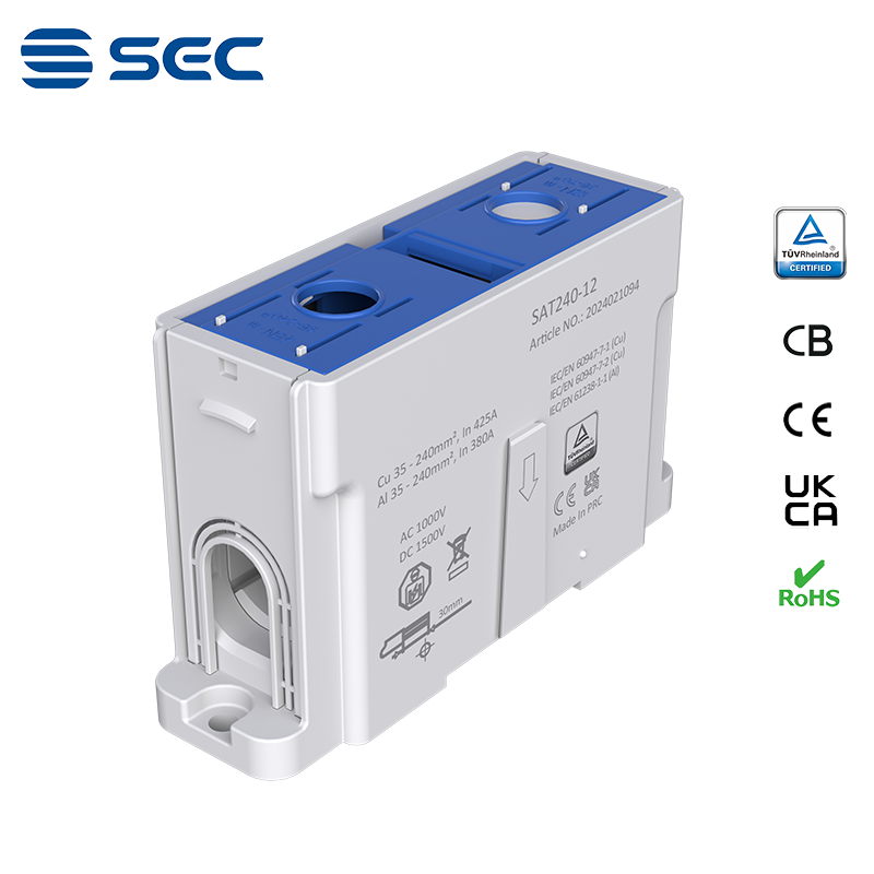 SAT series Al/Cu universal terminal block is totally patent design product by STRONG ELECTRIC, which offers the best quality, safety installation features in the market. All the product already got TUV mark, CB, CE, UKCA, RoHS certificate. It was designed for both copper conductor and Aluminum conductor. The most important is this terminal block are allowed each pieces of product can connect each other easily.
