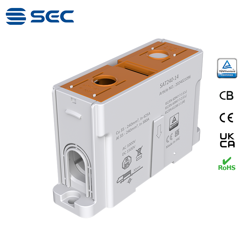 SAT series Al/Cu universal terminal block is totally patent design product by STRONG ELECTRIC, which offers the best quality, safety installation features in the market. All the product already got TUV mark, CB, CE, UKCA, RoHS certificate. It was designed for both copper conductor and Aluminum conductor. The most important is this terminal block are allowed each pieces of product can connect each other easily.
