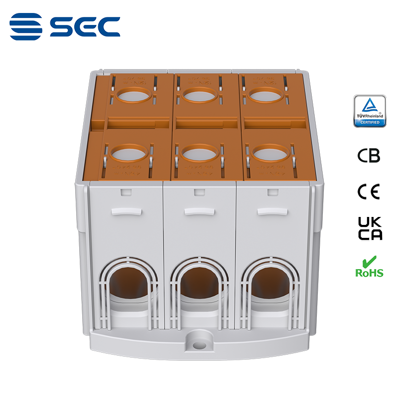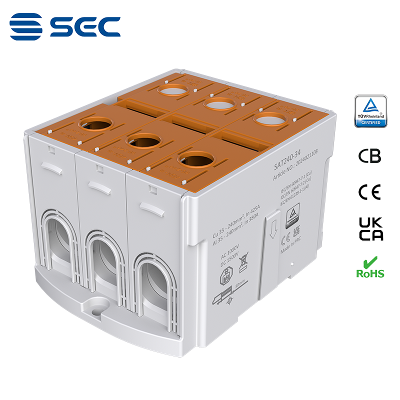 SAT series Al/Cu universal terminal block is totally patent design product by STRONG ELECTRIC, which offers the best quality, safety installation features in the market. All the product already got TUV mark, CB, CE, UKCA, RoHS certificate. It was designed for both copper conductor and Aluminum conductor. The most important is this terminal block are allowed each pieces of product can connect each other easily.